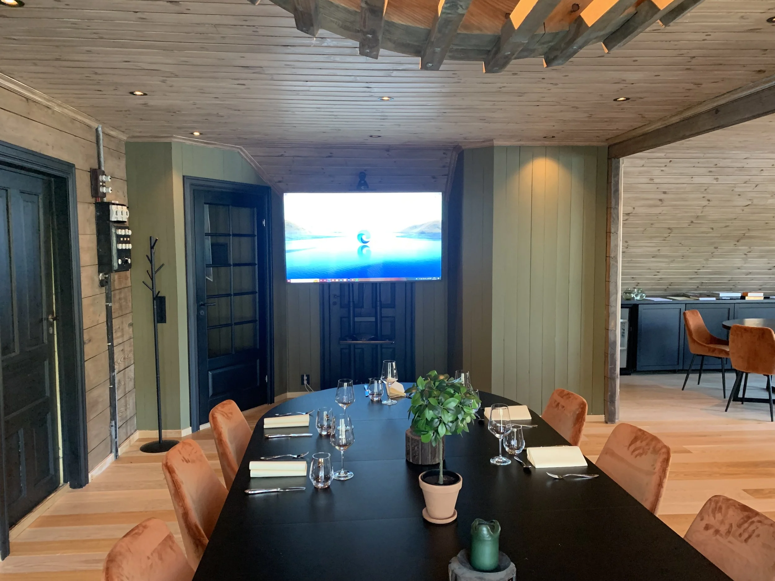 Møterommet har 65¨ TV-skjerm med tilkobling til PC/Mac via HDMI kabel, utsyr til digitale møter f.eks Teams eller Zoom. Me kan tilrettelegge med mat, forfriskningar og underhaldning.